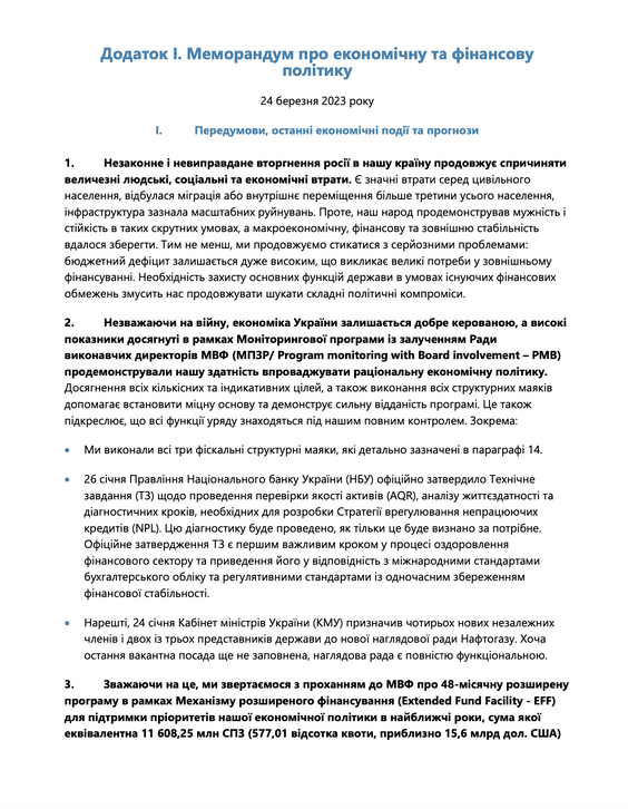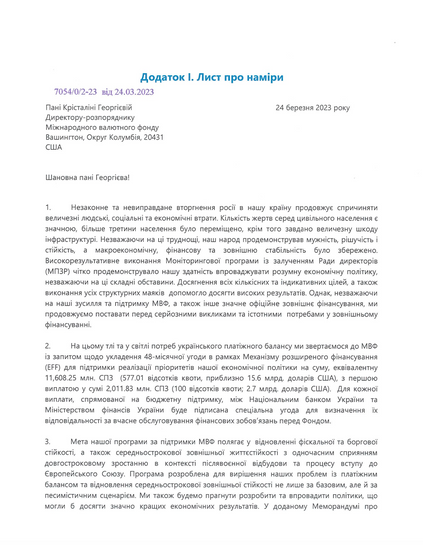 Лист про наміри до Міжнародного валютного фонду від 19 червня 2023 року та Меморандум про економічну та фінансову політику Міжнародного валютного фонду.